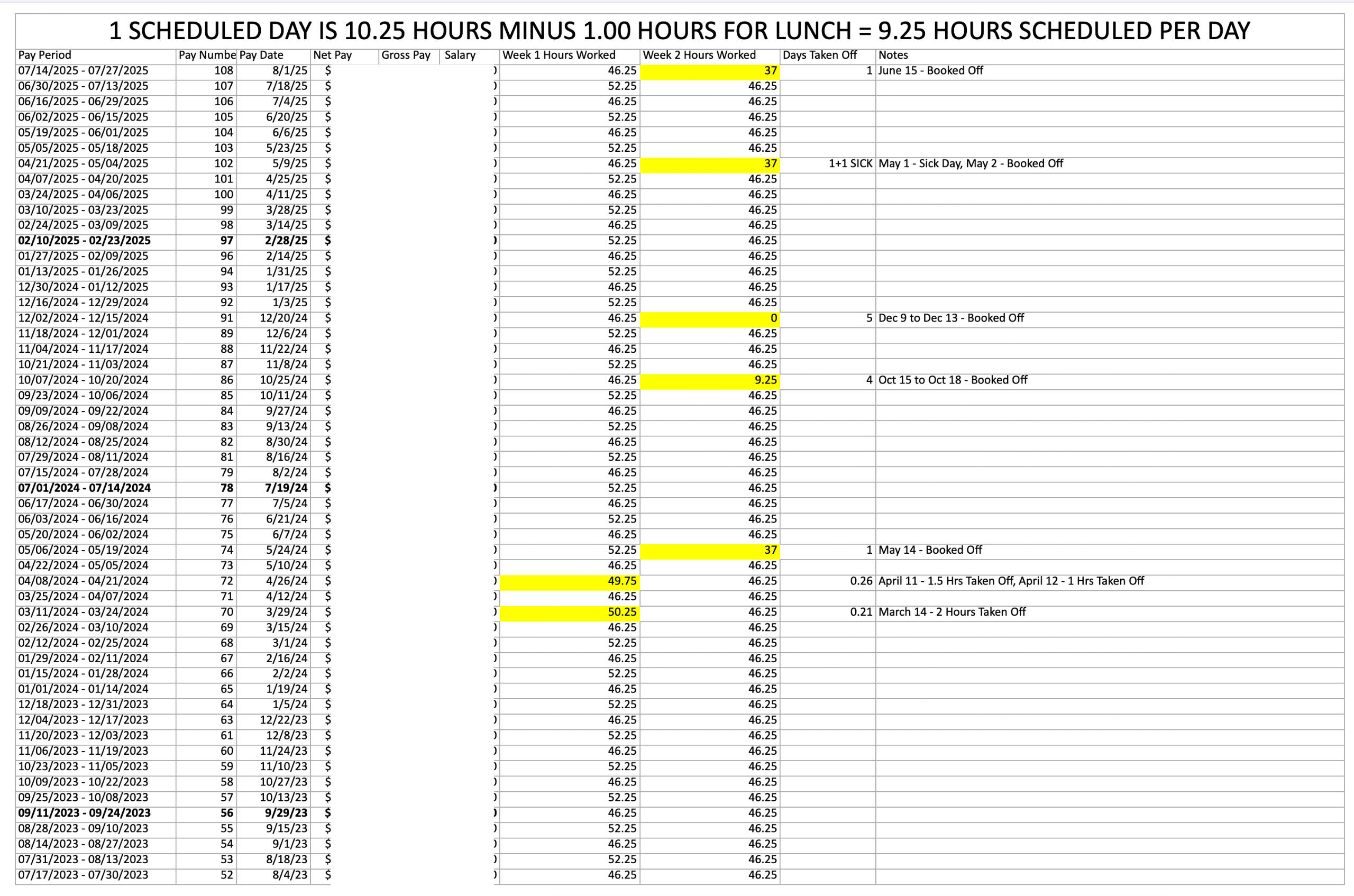 Based on my pay records, I was treated as a salaried employee calculated on a 40-hour work week.However, my actual hours worked were a minimum of 46.25 hours per week, and in certain weeks, including scheduled Saturdays, totalled 52 hours.The table below is a detailed record of my own weekly and bi-weekly hour logs, showing each pay period between 2021 and 2025.This spreadsheet demonstrates that I routinely worked more hours than reflected on my 40-hour pay stubs.