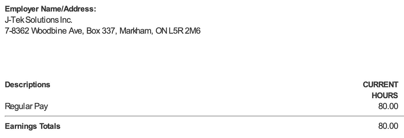 According to my records, I consistently worked between 46.25 and 52 hours per week for nearly four years, while my pay was calculated only on a 40-hour work week.The pay stub excerpt below shows a standard 80.00 hours per two-week pay period, equal to 40 hours per week, which does not reflect the additional hours worked.