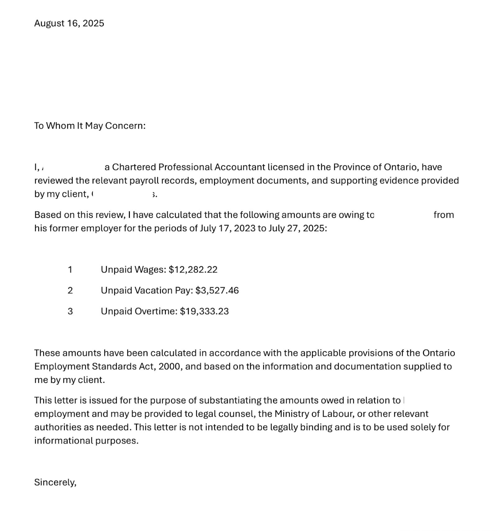 After consulting twice with the Ontario Ministry of Labour, an employment lawyer, and a Chartered Professional Accountant (CPA), I filed an official Employment Standards Act (ESA) claim for $35,142.91 CAD.This amount is based on the CPA’s formal written calculation (shown below), which details unpaid wages, vacation pay, and overtime owed for the period July 17, 2023 to July 27, 2025.These totals were calculated in accordance with the Ontario Employment Standards Act, 2000, and were submitted as supporting evidence with my ESA claim. The statute of limitations on claims is 2 years.