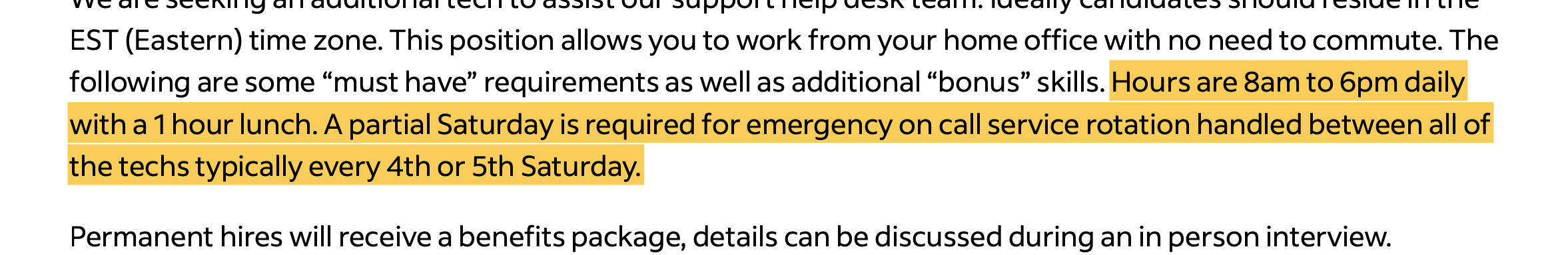 Each workday, myself and up to six other employees began working remotely at 7:45 a.m. Eastern Time and finished at 6:00 p.m., with a one-hour lunch break. We typically checked in each morning via the team’s WhatsApp group.On approximately one Saturday per month, full-time staff, including myself, worked an additional six-hour shift.The image below shows a PDF copy of JTEK’s own job posting, which describes the position in the company’s words.
